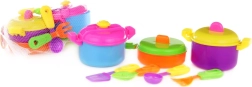 Amusant set de vaisselle pour enfants dans un filet pratique pour les petits chefs dès 3 ans. Comprend 2 casseroles avec couvercles, une poêle avec couvercle et 4 ustensiles de cuisine, idéal pour jouer à cuisiner et stimuler l’imagination.
