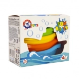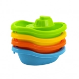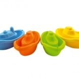Le set comprend quatre bateaux aux couleurs vives — bleu, orange, vert et jaune — qui peuvent être facilement empilés pour un rangement simple. La forme et les couleurs des bateaux stimulent l’imagination et la créativité des enfants pendant les jeux d’eau.