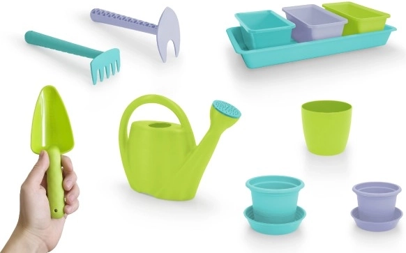 Le grand ensemble de jardin Gardenico Kids est idéal pour les petits jardiniers. Il contient tout le nécessaire pour cultiver des herbes et d'autres plantes, y compris des outils pour enfants, un ensemble de mini-bac, des pots de fleurs et des soucoupes.
