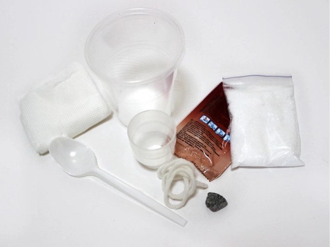 - phosphate dihydrogéné d’ammonium, colorant alimentaire vert, bécher, 2 gobelets en plastique, cuillère en plastique, fil de laine, mouchoir en papier, petite pierre, mode d’emploi en tchèque