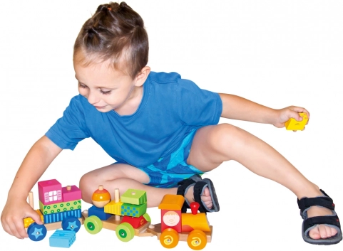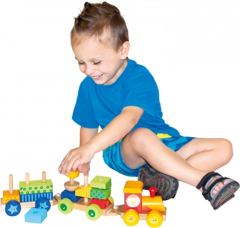 Le train en bois multifonctionnel est non seulement un jouet à tirer, mais aussi un jeu de construction qui permet aux enfants de développer leur créativité. Le train comprend trois châssis et 18 blocs différents à assembler selon l'imagination.