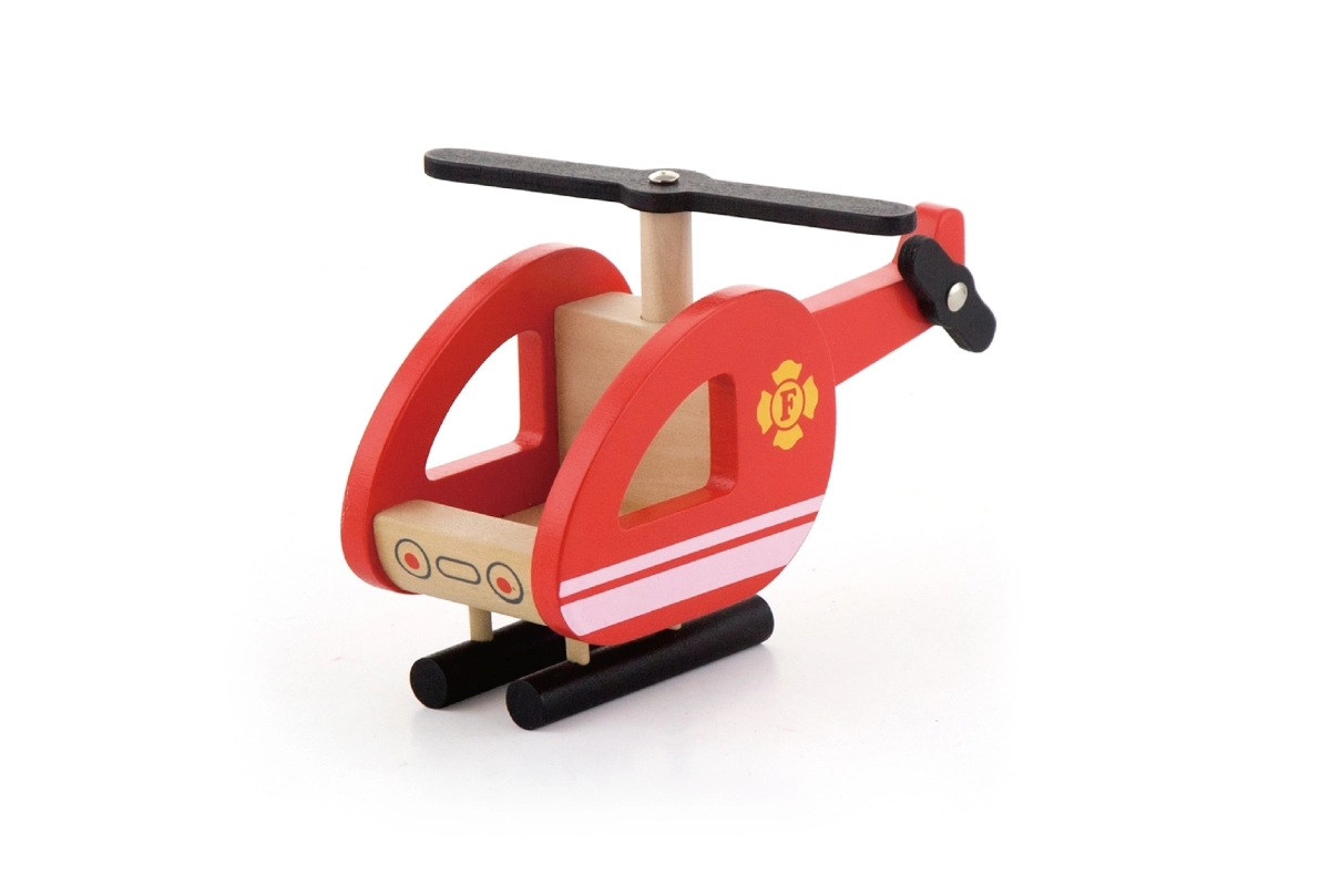Petit hélicoptère en bois avec rotor tournant et patins stables pour compléter chaque mission de sauvetage vue du ciel.