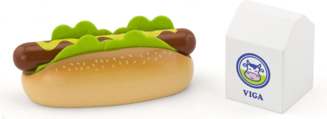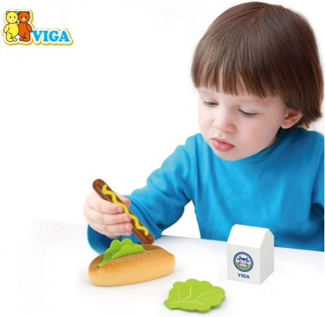 Ce set en bois de haute qualité VIGA offre aux enfants un jeu de cuisine réaliste. Le hot-dog avec pain, salade et moutarde, ainsi que la « brique de lait », développent la créativité et initient les enfants aux bases du jeu social. Grâce à sa fabrication robuste en bois, l’ensemble est idéal pour un usage quotidien.