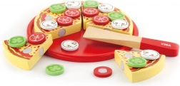 La pizza est divisée en parts et accompagnée d'une spatule/d'un petit couteau, pour que les enfants puissent couper et servir comme dans une vraie pizzeria.
