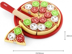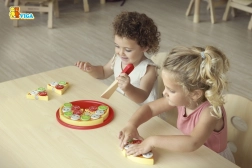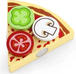 Différents toppings en bois (p. ex. champignons, poivrons, tomates) stimulent l'imagination et l'apprentissage des couleurs et des formes.