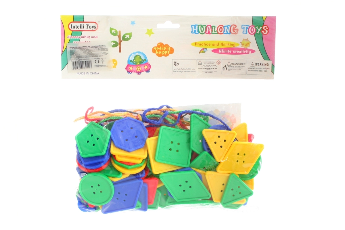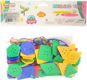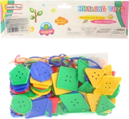 Formes et boutons à enfiler – un jouet didactique amusant pour les enfants dès 3 ans, qui développe la motricité fine et la créativité. Contient des boutons colorés et des lacets pour un enfilage facile.