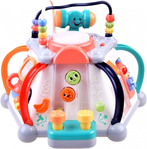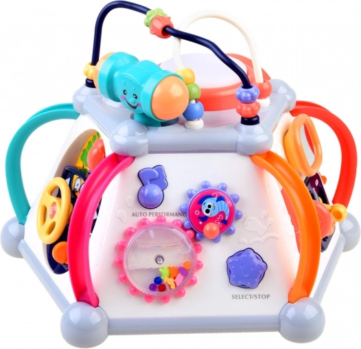 - Volant avec klaxon et son de moteur, engrenages avec mélodies et lumières, microphone coulissant avec réglage du volume, face avec marteau et tunnel pour bille, téléphone avec boutons et défilement d’images, tambour lumineux, labyrinthes à perles