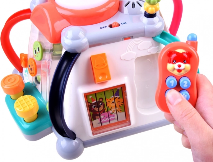 La multibox HOLA offre une riche palette d’activités pour les tout-petits. Chaque face propose un type de jeu différent – de la conduite d’une petite voiture aux engrenages avec lumières et mélodies, jusqu’au microphone avec un « téléviseur » rétroéclairé. La partie supérieure cache des labyrinthes à perles, un tambour lumineux et un espace de rangement pour le marteau. Le tout est conçu pour les petites mains et une exploration en toute sécurité.