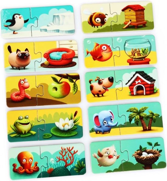 L’ensemble ludique Puzzlika Ma maison apprend aux enfants à associer les animaux à leurs habitats. Il contient 20 grandes pièces solides formant 10 paires. Il stimule la pensée logique, le développement de la motricité fine, la connaissance des animaux et de leur environnement ainsi que la perception visuelle. Fabriqué en carton multicouche résistant avec une finition brillante, facile à nettoyer et idéal pour les enfants d’âge préscolaire.