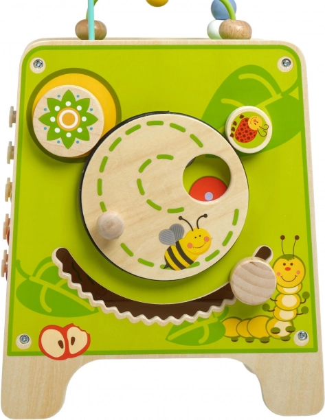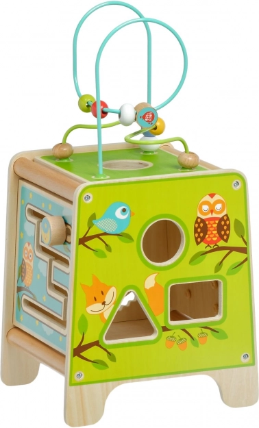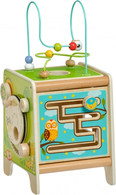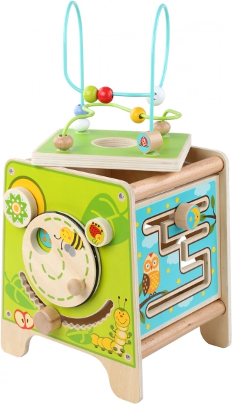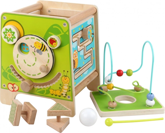 Ce cube d’activités en bois coloré offre des heures de jeu riche de sens. Le labyrinthe de perles supérieur peut être retiré et retourné à l’intérieur du cube pour un rangement facile. Sur les côtés, les enfants découvrent un xylophone avec mailloches, une boîte à formes composée de pièces géométriques rotatives en deux parties, un labyrinthe de motricité, une roue tournante, des éléments rotatifs et un jeu amusant avec glissement de chevilles dans une rainure.
