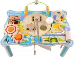 La table en bois aux motifs de jungle allie jeu et apprentissage et favorise la motricité fine, la coordination œil-main et la pensée logique. Les enfants peuvent faire tourner des engrenages, faire glisser des perles le long d’un rail, entraîner force et concentration avec le banc à marteler et s’exercer à la reconnaissance des formes grâce à la boîte d’encastrement. Au centre se trouve un sac en lin pour les poissons pêchés et les pièces de jeu, qui maintient la surface de jeu en ordre.