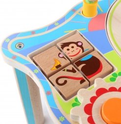 - Plusieurs activités en une : engrenages, perles, banc à marteler, boîte de formes, pêche magnétique