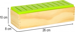 Boîte solide en bois lisse et couvercle vert avec fentes pour un insertion facile. Bords sûrs, soigneusement poncés.
