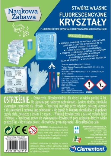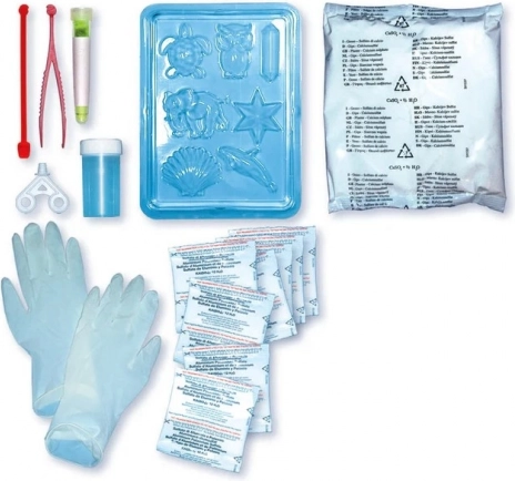 Kit scientifique pour créer des cristaux fluorescents. Contient plâtre, moules, alunite et sulfate de potassium. Procédure simple, excellents résultats. Conçu en Italie.