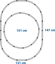 Le système de rails permet de créer deux circuits, un intérieur de 101 cm et un extérieur de 147 cm.