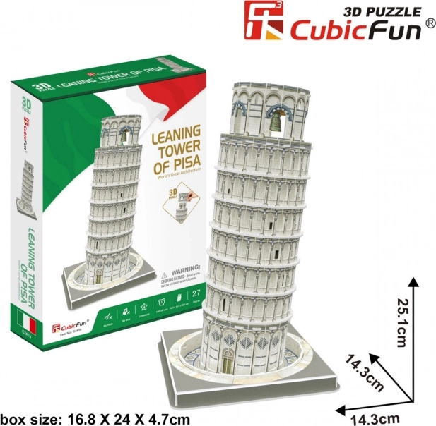 Avec ce kit de puzzle 3D, il est possible de créer sa propre réplique de la célèbre Tour penchée de Pise. Le kit comprend 27 pièces fabriquées dans un matériau spécial rappelant la mousse. Les pièces sont numérotées, prédécoupées sur des planches et faciles à retirer puis à assembler en suivant le mode d’emploi fourni. Le montage ne nécessite ni colle ni outils spéciaux, ce qui signifie que même les débutants apprécieront ce projet. Une fois assemblée, la construction mesure 14,3 x 14,3 x 25 cm.