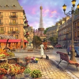 La scène inclut une atmosphère de rue animée avec des étals de fleurs et une architecture classique, soulignant la richesse des détails et la vitalité.