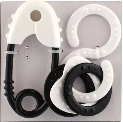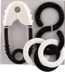 Cet ensemble de hochets comprend une épingle classique et une figure en huit avec des anneaux.