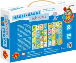 - 16 grandes cartes colorées (32 devinettes illustrées), notice en tchèque et en slovaque, boîte rigide avec poignée