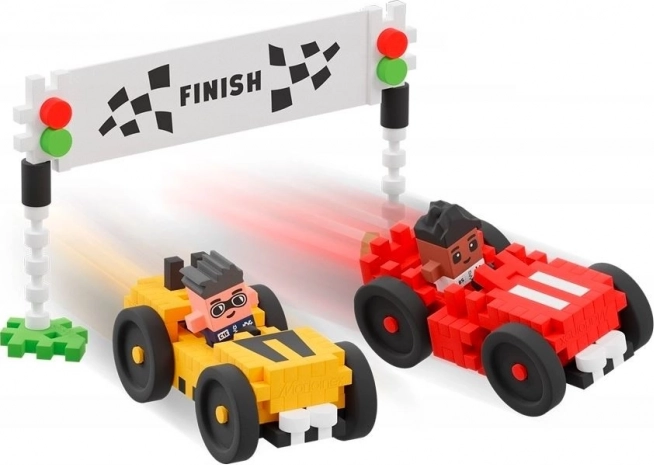 Coffret de course Waffle Mini : 80 pièces, 2 figurines, banderole d’arrivée et notice pas à pas. Construction créative 2D/3D avec matériaux sûrs pour enfants dès 5 ans.