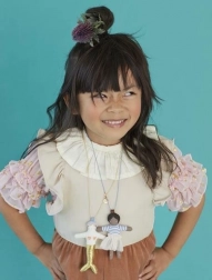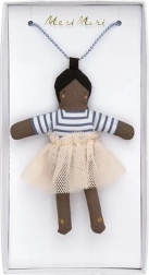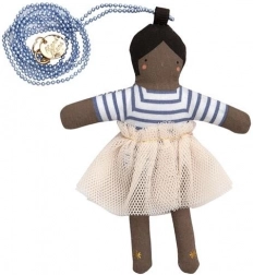 Le collier est confectionné avec une poupée magistralement travaillée nommée Ruby et une chaîne bleue avec perles. La poupée Ruby est en coton, et possède une jolie jupe en tulle couleur pêche.