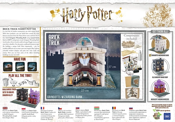 Découvrez le plaisir de construire avec l’unique set Brick Trick HARRY POTTER, qui vous permet d’ériger pas à pas la célèbre Banque des sorciers de Gringotts. À partir de matériaux naturels, vous bâtirez un édifice solide et détaillé, que vous compléterez avec les décorations fournies – y compris des éléments iconiques du monde de la magie.