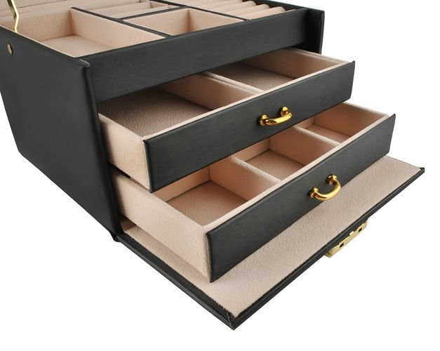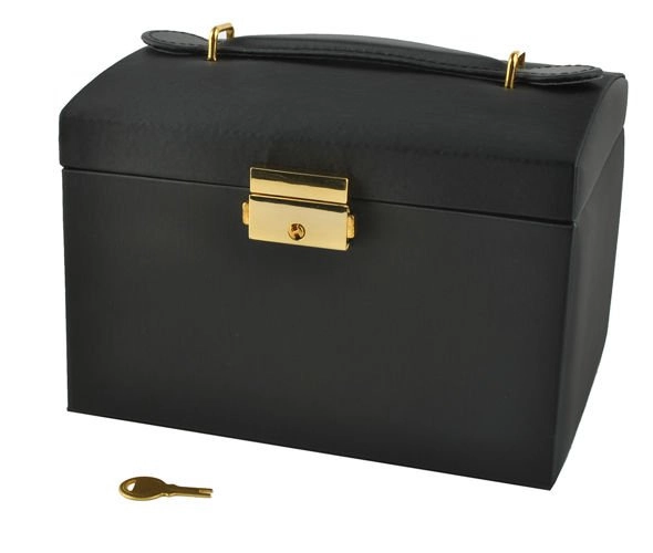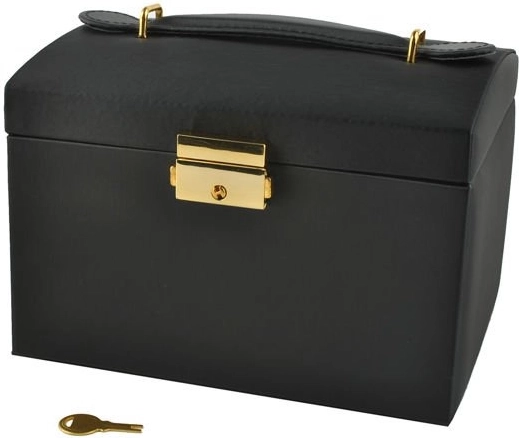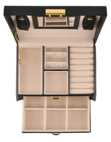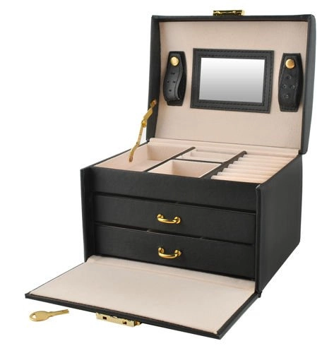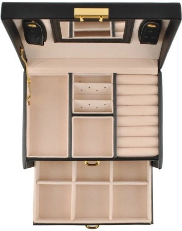 Le cuir PU noir avec des accents dorés et le miroir pratique intégré au couvercle allient style et fonctionnalité pour l’entretien quotidien de vos bijoux.