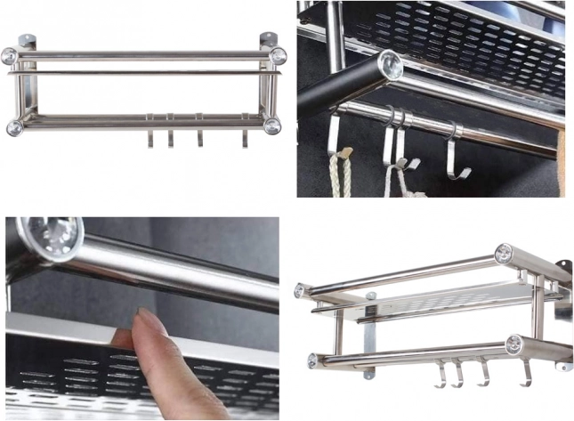Élégante étagère murale de salle de bain de couleur argentée combinant une surface de rangement spacieuse, deux barres à serviettes et quatre crochets pratiques. Sa structure en aluminium, légère et résistante, est idéale pour un usage quotidien et, grâce à son design universel, s’intègre aux intérieurs modernes comme classiques.