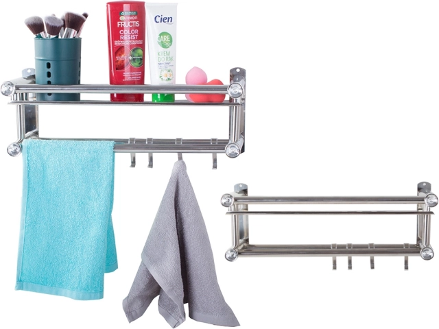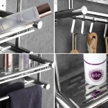 Cette étagère murale de salle de bain offre une solution astucieuse pour gagner de la place et maintenir l’ordre sous la douche ou près du lavabo. La surface supérieure accueille aisément cosmétiques et accessoires, tandis que la partie inférieure propose une double barre à serviettes et quatre crochets pour les compléments. Son style minimaliste argenté apporte une touche épurée et élégante.