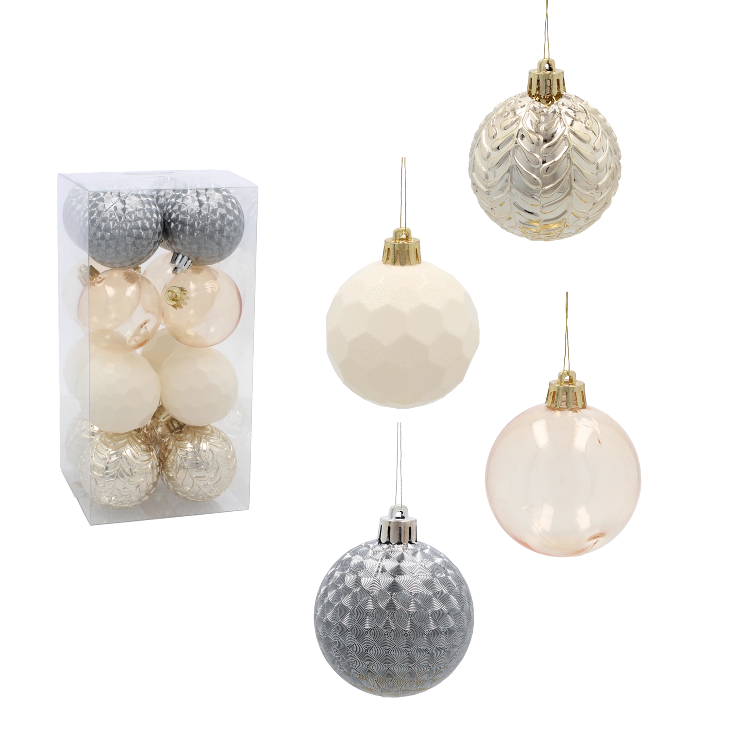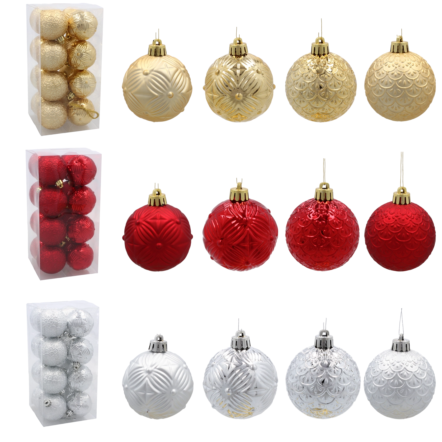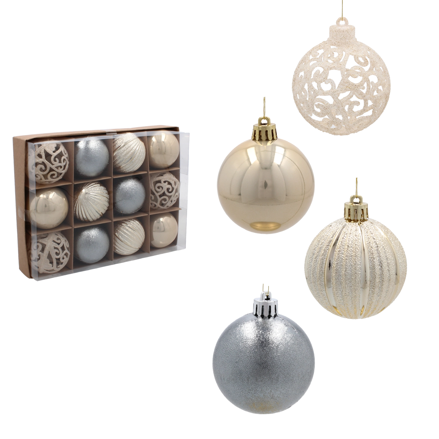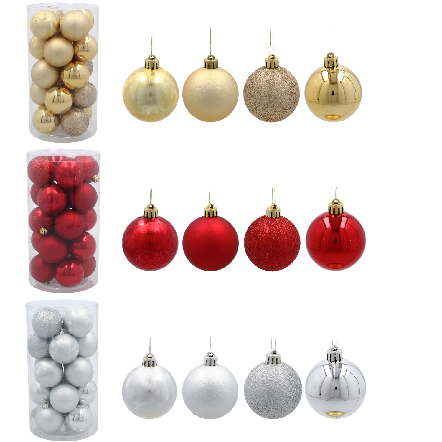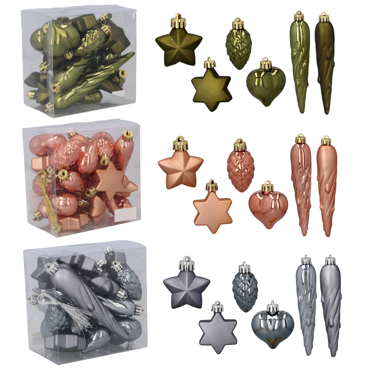 Kies uit populaire materialen: glazen versieringen met subtiele decoratie, onbreekbare kunststof ballen en bollen die ideaal zijn voor gezinnen, houten ornamenten en papieren sterren voor een natuurlijke look. Er zijn sets verkrijgbaar in rood, goud, zilver, wit, champagne of blauw, met afwerkingen zoals mat, glanzend, glitterend en parelmoer. Diverse maten en vormen, van mini tot XXL, laten je zowel kleine als grote bomen versieren en zorgen voor een uniforme uitstraling.