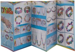 Kleurrijk boekje met instructies voor het maken van kettingen en armbanden, dat kinderen verschillende patronen laat zien.