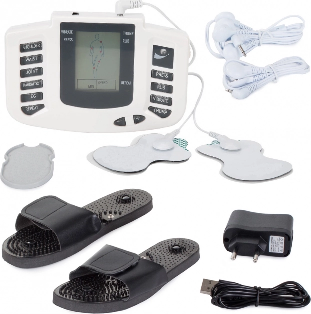 Het apparaat bevat een paar clip-electroden die dienen als elektroden voor de voeten, wat een massage van vermoeide voeten na een lange dag mogelijk maakt. Elektrodepads kunnen op verschillende delen van het lichaam worden aangebracht en bieden meerdere massagemodi zoals SHOULDER voor schouders, WAIST voor taille, JOINT voor gewrichten en meer.