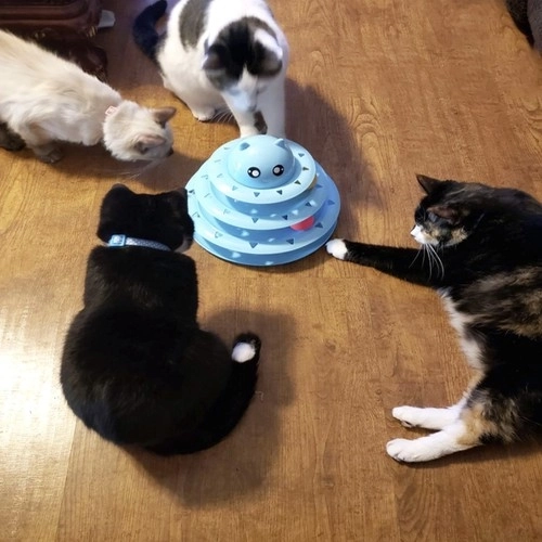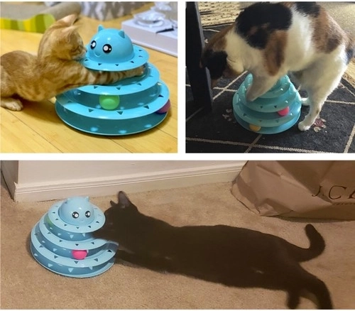 Het systeem van drie niveaus en bewegende ballen biedt katten fysieke activiteit en mentale stimulatie.