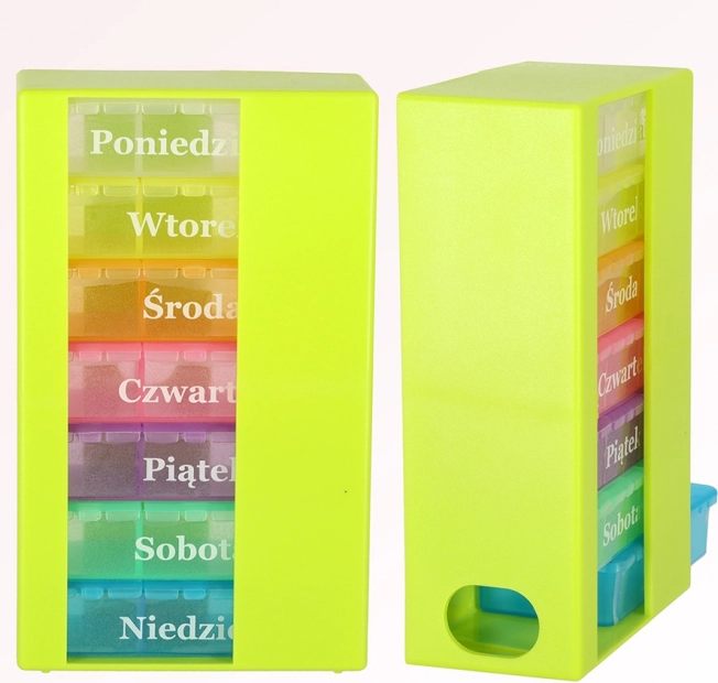 Elk compartiment is kleurrijk gemarkeerd en voorzien van labels, waardoor het identificeren van de dag waarvoor het bedoeld is eenvoudiger wordt. Praktische verpakking, ideaal voor reizen of dagelijks gebruik.