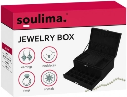 Stijlvolle en praktische sieradendoos SOULIMA in elegante zwarte kleur zorgt voor perfect geordende opslag van sieraden thuis en onderweg. Heeft meerdere niveaus en diverse vakjes voor ringen, oorbellen, kettingen, armbanden en horloges, vergrendeling met sleutel voor extra veiligheid en een zacht fluwelen oppervlak dat beschermt tegen krassen en stof.