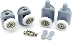 De set bevat acht wielen die zorgen voor een soepele en probleemloze beweging van de douchedeuren. Elk wiel heeft een stevige constructie van plastic en staal.