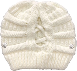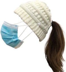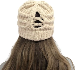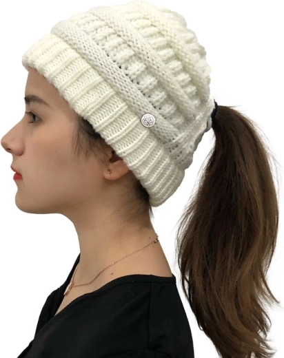 Praktische, warme muts met een speciale opening voor een paardenstaart. Zelfs onder de muts kun je je mooie haar laten zien. Zodra je de muts afzet, is je eigen haar niet in de war.