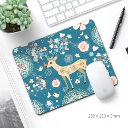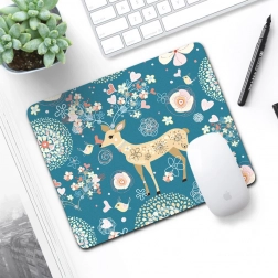 Deze decoratieve muismat met een zachte blauwe achtergrond en een speels herten-, vogel- en bloemenmotief verfraait elk bureau. Het textiele oppervlak zorgt voor een vloeiende muisbeweging en hoge cursorprecisie, terwijl de rubberen onderzijde de mat stevig op zijn plaats houdt.