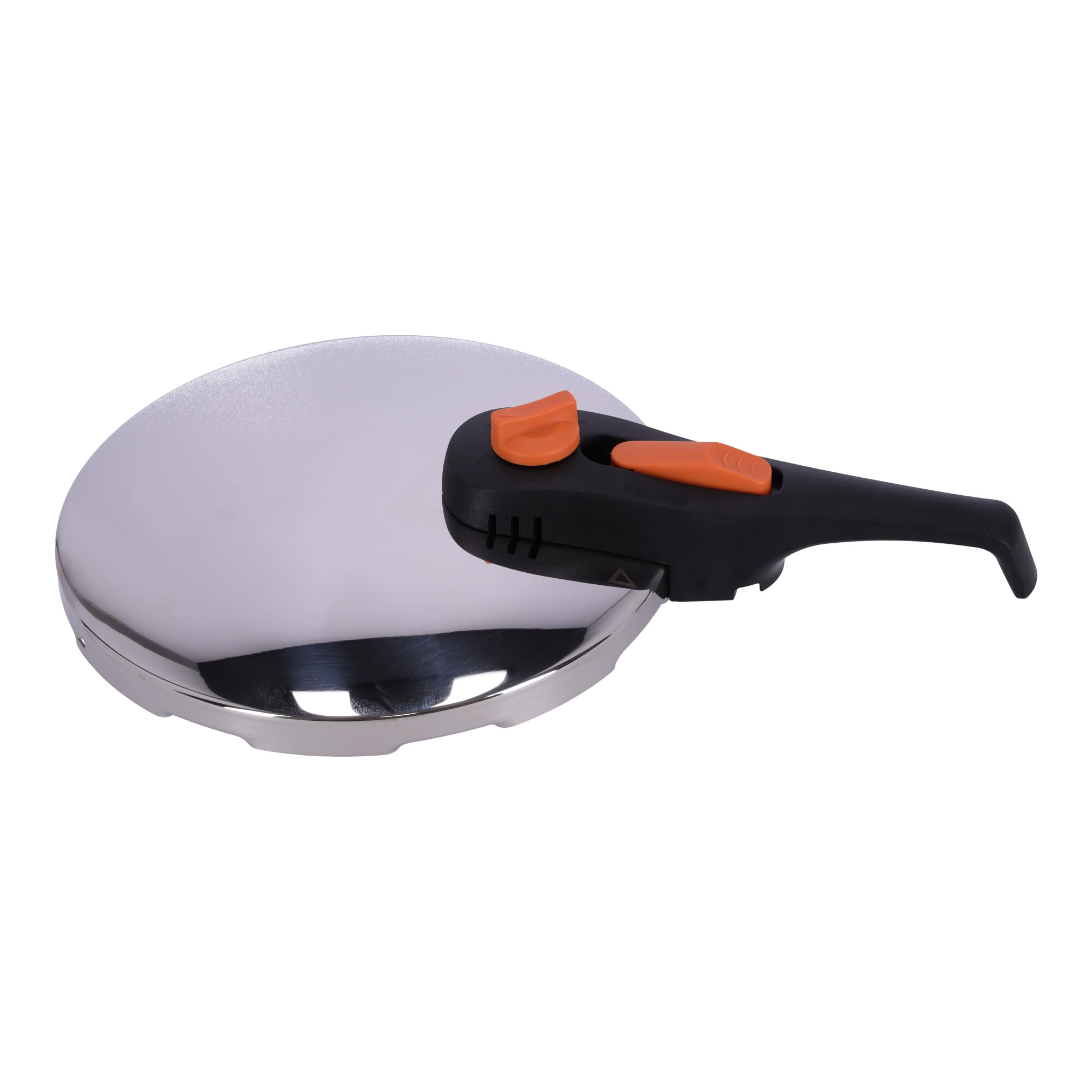 Dankzij de twee drukinstellingen (0,6 / 0,9 bar) pas je de bereiding eenvoudig aan verschillende ingrediënten aan – van peulvruchten en vlees tot groenten. De siliconen afdichting houdt de druk betrouwbaar vast, ergonomische handgrepen liggen prettig in de hand en de pan is compatibel met alle warmtebronnen, inclusief inductie.