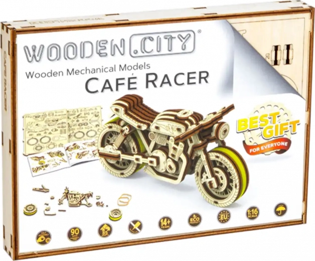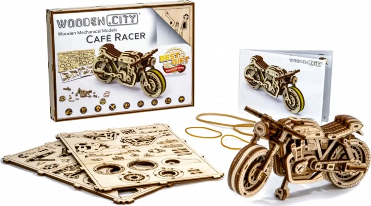 De Café Racer-motor van WOODEN CITY is een gedetailleerd houten model op schaal 1:16 dat je bureau of vitrinekast tot leven brengt. Dankzij de elastiekmotor en de terugtrekfunctie beweegt het model voor- en achteruit, haalt het een afstand van ongeveer 1 meter en biedt het zicht op echte tandwielmechanica.