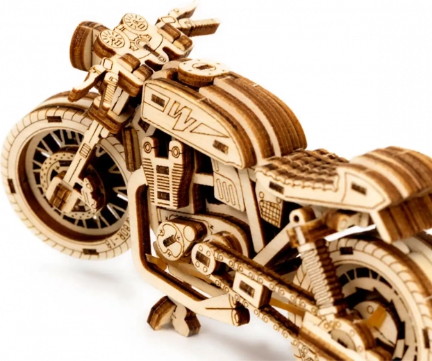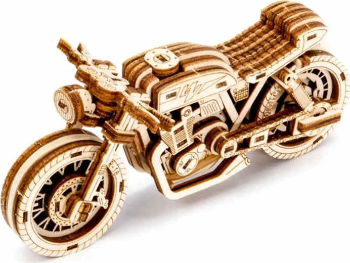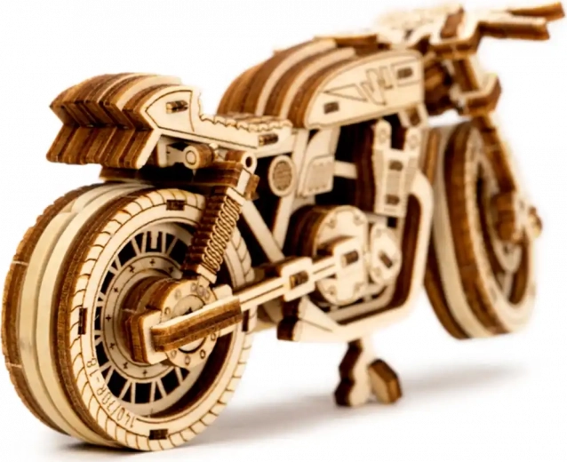 Bouw een stijlvolle Café Racer-motor van natuurlijke multiplex en geniet van de functionele mechanica. Dankzij de terugtrekfunctie en de elastiekmotor rijdt het model tot wel 1 meter ver, met rubberen wielen, een traagheidsmechanisme en realistische bedieningsonderdelen. De montage verloopt zonder lijm of gereedschap en de verpakking dient als standaard.