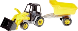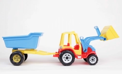 Tractor met een brede, beweegbare voorlader aan de voorzijde van het speelgoed en een afneembare aanhangwagen aan de achterzijde. De blauwe aanhangwagen, die naar achteren kan kiepen, is geplaatst op een enkelassig chassis. De set heeft bewegende elementen die het spel van uw kind aantrekkelijker maken en zijn ontwikkeling positief beïnvloeden.