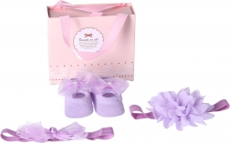 Zachte paarse babyschoentjes met een decoratieve strik en een klein rond steentje voor extra stijl.