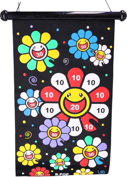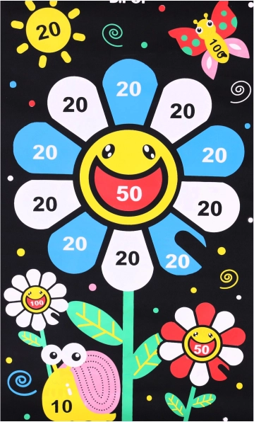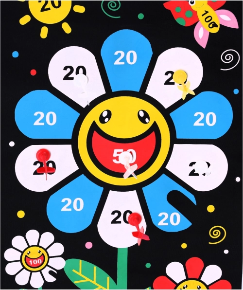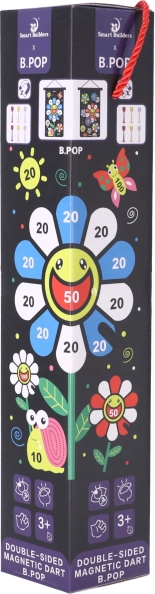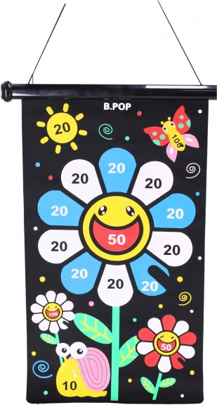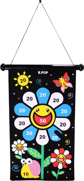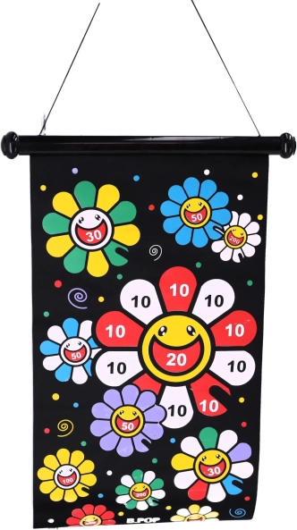 Het veilige, dubbelzijdige magnetische dartspel biedt veel plezier voor zowel kinderen als volwassenen. Het spel bestaat uit het nauwkeurig gooien van pijlen op gemarkeerde punten op het bord. De set bevat 6 magnetische pijlen in drie kleuren: wit, geel en rood. Het zwarte textiele bord is versierd met een kleurrijke bloem die helpt bij het oefenen van vaardigheid en concentratie. De rolbare functie van het bord maakt opbergen en transporteren gemakkelijker.