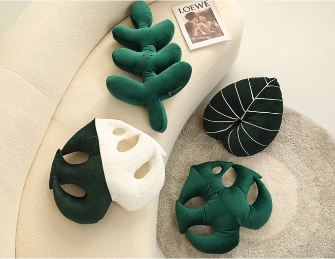 Breng een frisse uitstraling in je interieur met dit decoratieve kussen geïnspireerd op tropische bladeren. Het is zacht, aangenaam om aan te raken en biedt comfortabele ondersteuning tijdens het relaxen op de bank of in de fauteuil. De elegante snit met uitsparingen die doen denken aan Monstera-bladeren werkt als een opvallend accent in de woonkamer, slaapkamer en werkkamer.
