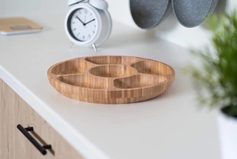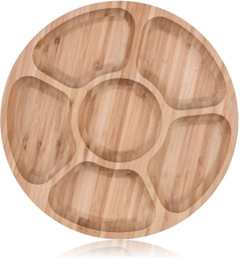 De gedeelde kom Brillante van natuurlijk bamboe is ideaal voor het serveren van verschillende lekkernijen. Dankzij de houten tussenschotten kun je meerdere soorten lekkernijen op één schaal serveren.