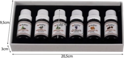 De set bevat zes verschillende geuren zoals eucalyptus, sinaasappel, tea tree, munt, lavendel en den. Elke olie is zorgvuldig verpakt in een flesje van 10 ml.