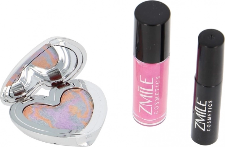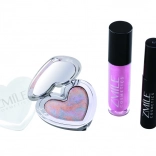Drie producten – oogschaduws in een hartvormig palette, lipgloss en mascara – vormen een praktische set voor dagelijkse en avondmake-up.