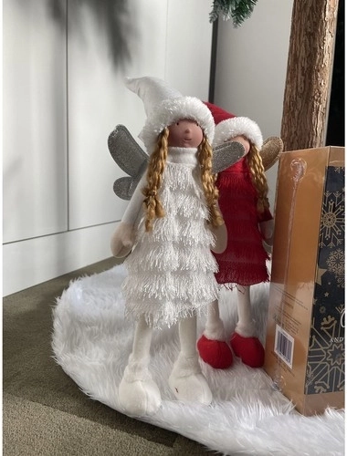 Een elegante kerstfiguur van een engel/elf in sneeuwwit brengt de magie van Kerst in je interieur. Hij heeft glinsterende vleugeltjes, stabiele schoenen met stevige zool en een winterse outfit met coljurk en muts met bont. Perfect voor op een dressoir, vensterbank, bij de open haard of onder de boom en een prachtige aanvulling op een feestelijke decoratie in zowel moderne als klassieke stijl.