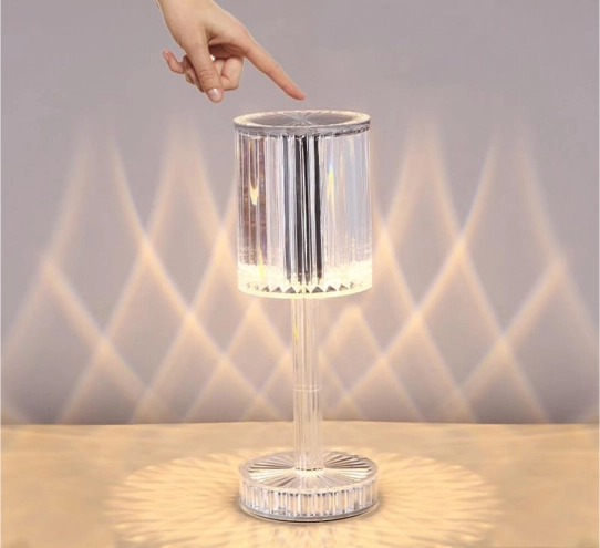 Creëer thuis een betoverende sfeer met deze elegante tafellamp met kristaleffect. Hij biedt RGB-achtergrondverlichting, afstandsbediening én touchbediening, voeding via USB‑C en een oplaadbare batterij. Dankzij het subtiele gefacetteerde oppervlak projecteert hij adembenemende lichtpatronen en past hij perfect in slaapkamer, woonkamer of werkkamer.